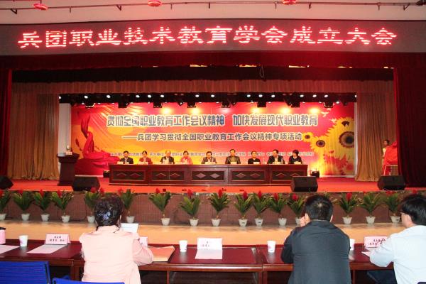 兵团职业技术教育学会成立大会现场 据了解,近年来兵团职业教育办学规模不断扩大,结构调整和内涵建设进一步加快。“十一五”以来,中央、援疆省市和兵团投入近7亿元加强职业教育基础能力,6所职业院校进入国家职业教育改革发展示范学校建设行列,建成48个中央财政支持的专业性实训基地,优质资源明显扩大。