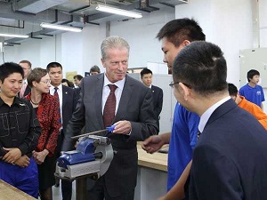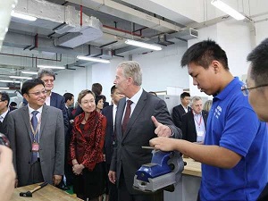 在上海市教委副主任陆靖、上海市教委职教处处长劳晓芸、上海信息技术学校校长邬宪伟等陪同下,米特雷纳副总理一行参观考察了中奥现代学徒制项目的教学和实训现场。